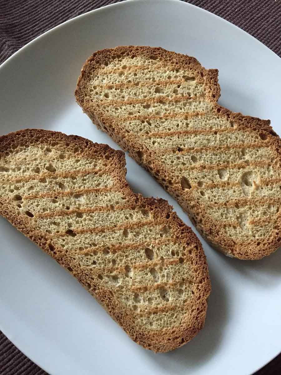 Also: abwarten, bis das Brot ausreichend stabilisiert ist, dann direkt aus dem Ofen holen und auf einem Gitter abkühlen lassen. Beim Abkühlen verliert das Brot noch ein bisschen mehr Wasser. Wenn du ein Brot schonmal heiss angeschnitten hast, wirst du gemerkt haben, dass die Krume noch sehr feucht und weich ist. Das Mundgefühl ist noch nicht ideal. Erst nach dem vollständigen Abkühlen ist der perfekte Endzustand erreicht. Das Brot ist saftig, aber nicht wirklich feucht. Wer mag, kann es jetzt nochmal toasten und damit etwas aufknuspern.