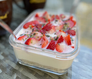 Kuchenbowl mit Buttermilchboden und einer Creme aus Joghurt und Frischkäse - getoppt mit Erdbeeren. [...]