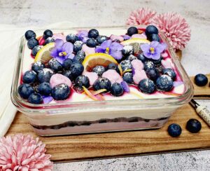 Fruchtige Kuchenbowl mit Joghurt, Pudding, Zitrone und Heidelbeeren. Pro Portion nur 234 Kalorien.