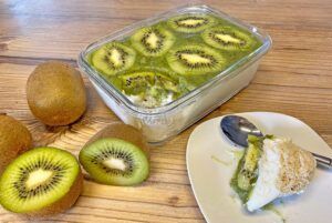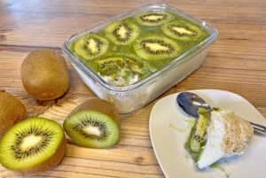Fruchtige Kuchenbowl mit Kiwi - perfekt für den Sommer. Pro Portion 19g Protein.