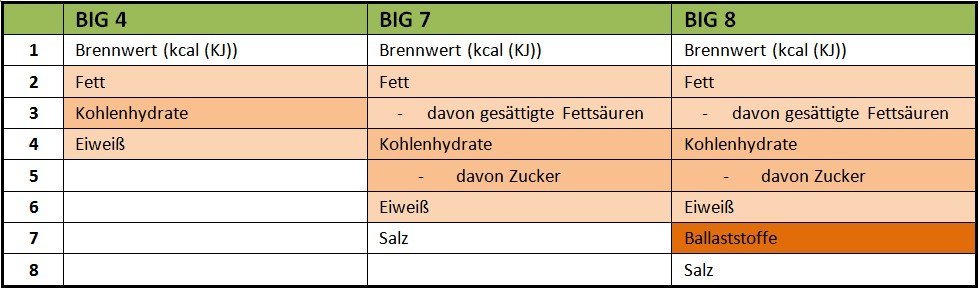 Bei der Big 4 werden lediglich die drei energieliefernden Nährstoffe (Fett, Kohlenhydrate, Eiweiß) aufgeführt, sowie der daraus resultierende Brennwert. Bei der Big 7 findet man genau die gleichen Werte wie bei der Big 4, aber man findet noch 3 zusätzliche Angaben: den Anteil an Zucker als Bestandteil der Gesamtkohlenhydrate, den Anteil an gesättigten Fettsäuren als Bestandteil der Gesamtfettmenge und den Gehalt an Salz.