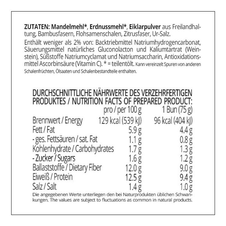 ZUTATEN: MANDELmehl*, ERDNUSSmehl*, EIKLARpulver aus Freilandhaltung, Bambusfasern, Flohsamenschalen, Zitrusfaser, Ur-Salz.
