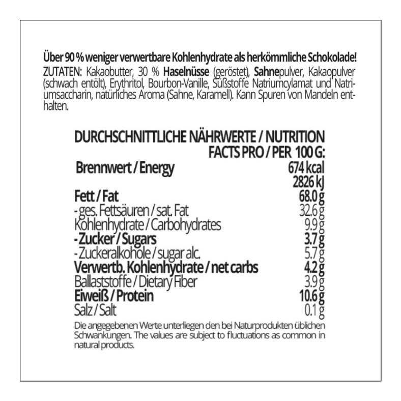 ZUTATEN: Kakaobutter, 30 % HASELNÜSSE (geröstet), SAHNEpulver, Kakaopulver (schwach entölt), Erythritol, Bourbon-Vanille, Süßstoffe Natriumcylamat und Natriumsaccharin, natürliches Aroma (Sahne, Karamell). Kann Spuren von anderen Schalenfrüchten enthalten.