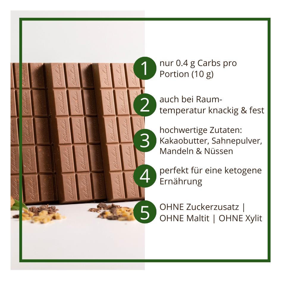 Choketo – Mehr als eine gesunde Alternative zu herkömmlicher Schokolade! Wusstest du, dass die meisten herkömmlichen Milchschokoladen zu über 50 % aus Zucker bestehen? Dieser liefert zwar schnelle, aber auch nur sehr kurzfristige Energie, da er den Blutzucker in die Höhe treibt – ihn anschließend aber auch schnell wieder absinken lässt. Der Hauptbestandteil von Choketo® ist reine, gesunde Kakaobutter und 0 g zugesetzter Zucker. Kakaobutter besteht aus gesättigten und einfach ungesättigten Fettsäuren und liefert dir langanhaltend Energie. Perfekt für jede low-carb & ketogene Ernährung!