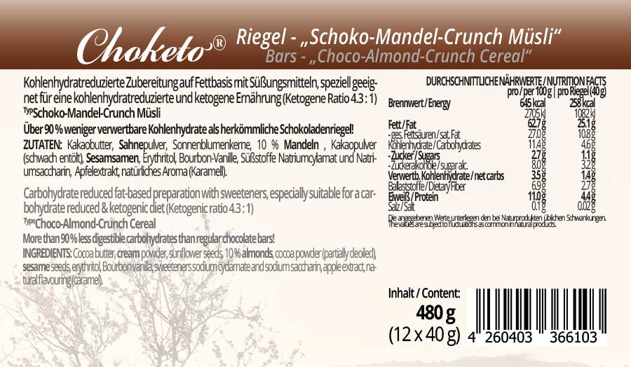 | CHOKETO Riegel Schoko-Mandel-Crunch Müsli / Bars Choco-Almond-Crunch Cereal | ||