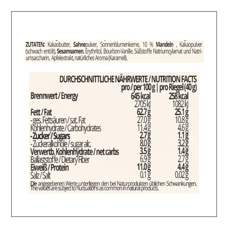 ZUTATEN: Kakaobutter, SAHNEpulver, Sonnenblumenkerne, 10 % MANDELN, Kakaopulver (schwach entölt), SESAMsamen, Erythritol, Bourbon-Vanille, Süßstoffe Natriumcylamat und Natriumsaccharin, Apfelextrakt, natürliches Aroma (Karamell).
