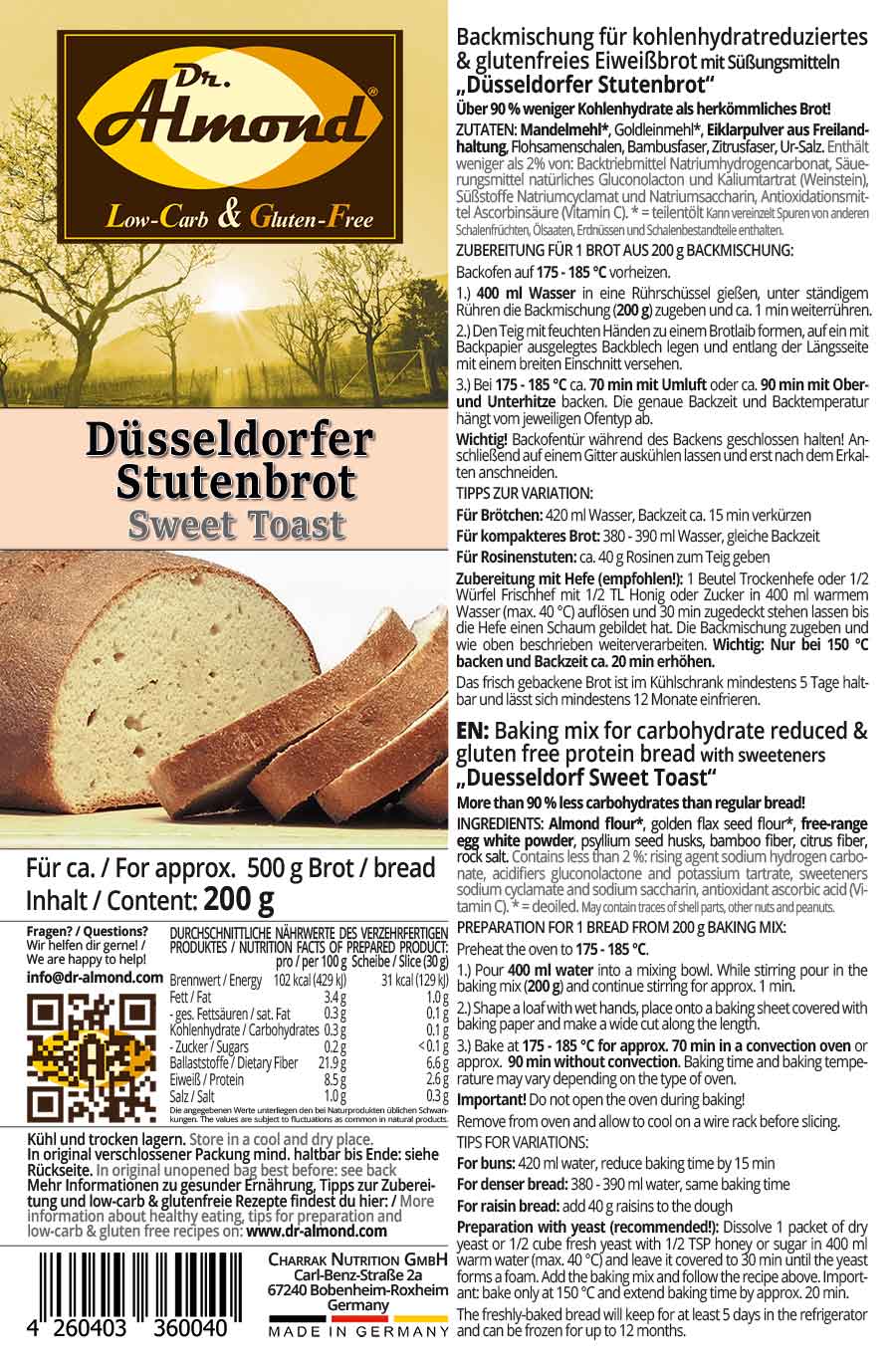 Das Düsseldorfer Stutenbrot ist ein mildes, süßes Weißbrot mit weicher Krume und zart-aromatischem Geschmack. Die Komposition aus zartem Mandelmehl und mildem Goldleinmehl kann wahlweise auch mit Hefe zubereitet und/oder mit Rosinen zu einem leckeren Rosinenstuten verfeinert werden (Hefe und Rosinen sind nicht in der Packung enthalten!).