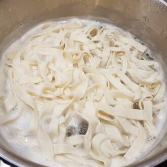 Die frische Pasta in kochendes Salzwasser (mind. 2 L) geben und bei mittlerer Hitze leicht köchelnd bis zu gewünschten Konsistenz garen, dabei gelegentlich umrühren. Die Kochzeit ist abhängig von der Dicke und Art der Pasta (z.B. ca. 2 – 3 min für Spaghetti und ca. 6 – 8 min für Penne). Nicht unbeaufsichtigt kochen lassen – neigt wegen Schaumbildung leicht zum Überkochen.