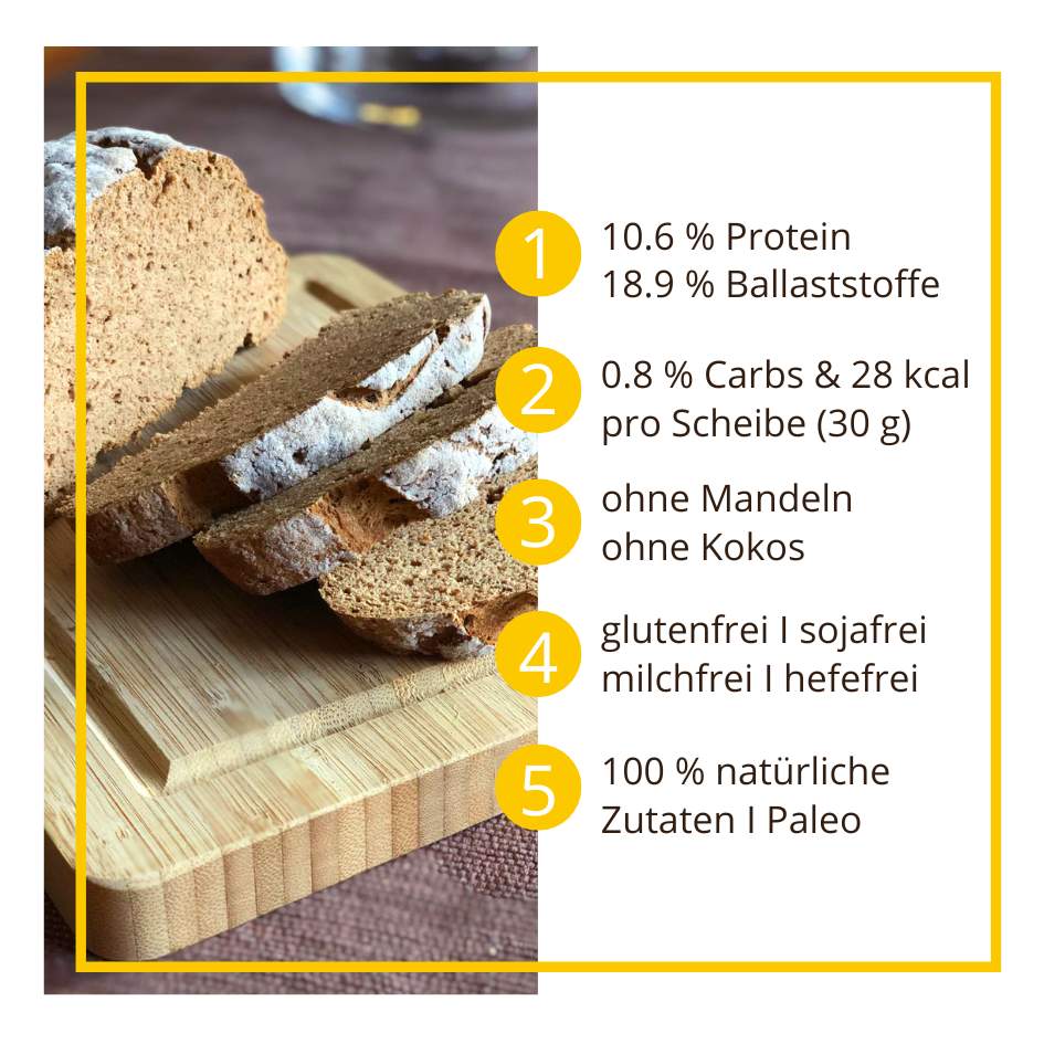 - 0.8 % Kohlenhydrate & 10.6 % Eiweiß | 18.9 % Ballaststoffe | 28 kcal pro Scheibe (30 g)