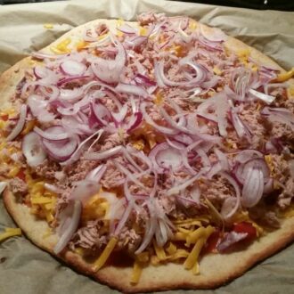 ist natürlich nicht so wie ein “normaler” Pizzateig, aber wenn man ihn länger im Ofen läßt, dann wird er schön knusprig. Vor allem eine Alternative zu Pizzateig mit Mehl.