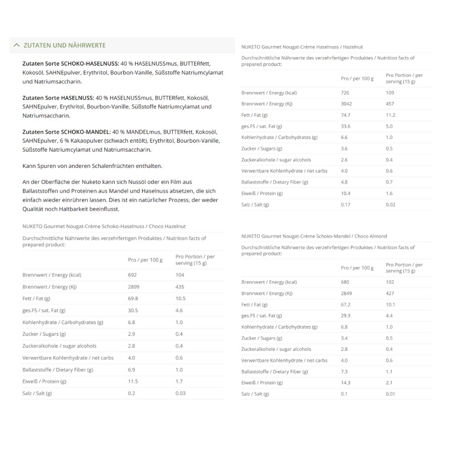 - himmlisch cremige Nougat-Cremes in 3 Sorten | nur 0.6 g verwertbare Kohlenhydrate pro Portion (15 g)