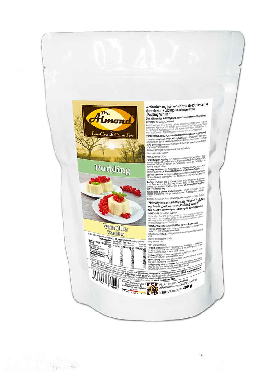 - Keto-tauglich: nur 1.5 g verwertbare Kohlenhydrate pro 100 g Pudding bei der Zubereitung mit Sahne