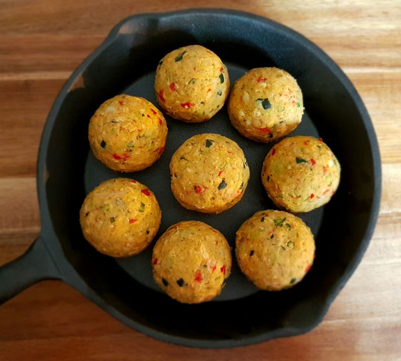 Knödel kann man auch im Backofen machen! Hier ein Beispiel: herzhafte Gemüseknödeln mit Käse und vielen Gewürzen. Pro Stück nur 199kcal und 5g KH.