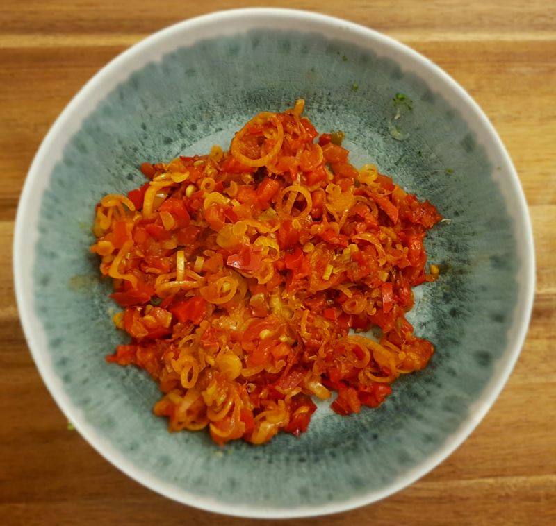 - Frühlingszwiebel, Tomate und Paprika gemeinsam mit etwas Butterschmalz in der Pfanne anbraten - auch so lange, bis sich keine Flüssigkeit mehr bildet. Zum Broccoli & Blumenkohl in die Schüssel geben.