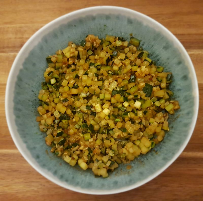 - 1 kleine Zucchini klein würfeln, mit Butterschmalz in der Pfanne anbraten, auch wieder so lange, bis sich keine Flüssigkeit mehr bildet.