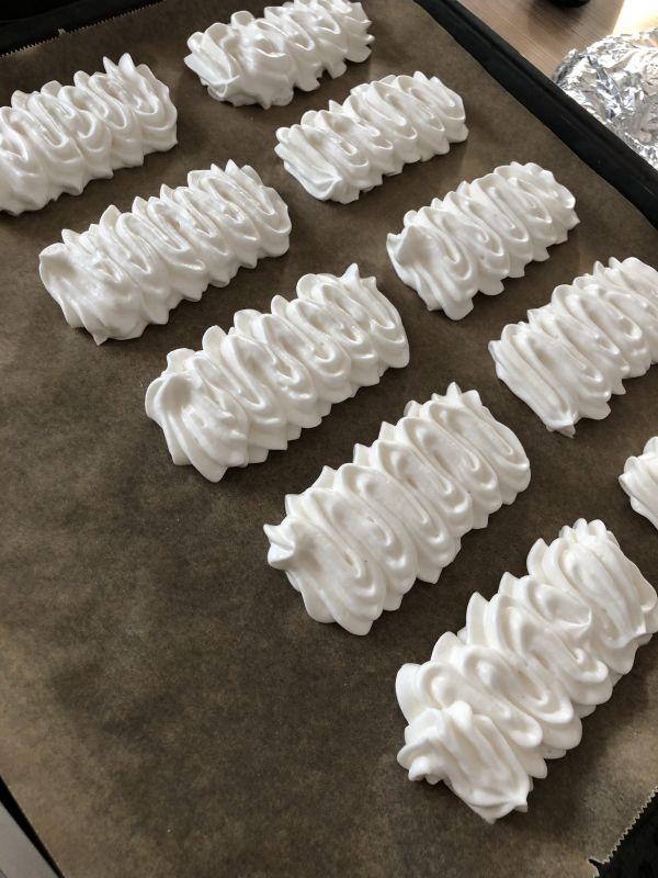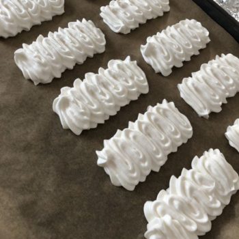 - Die Baisermasse nun mit einem Spritzbeutel mit Sterntülle in beliebiger Form auf ein mit Backpapier belegtes Backblech spritzen!