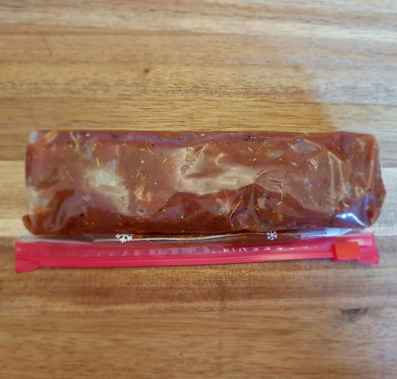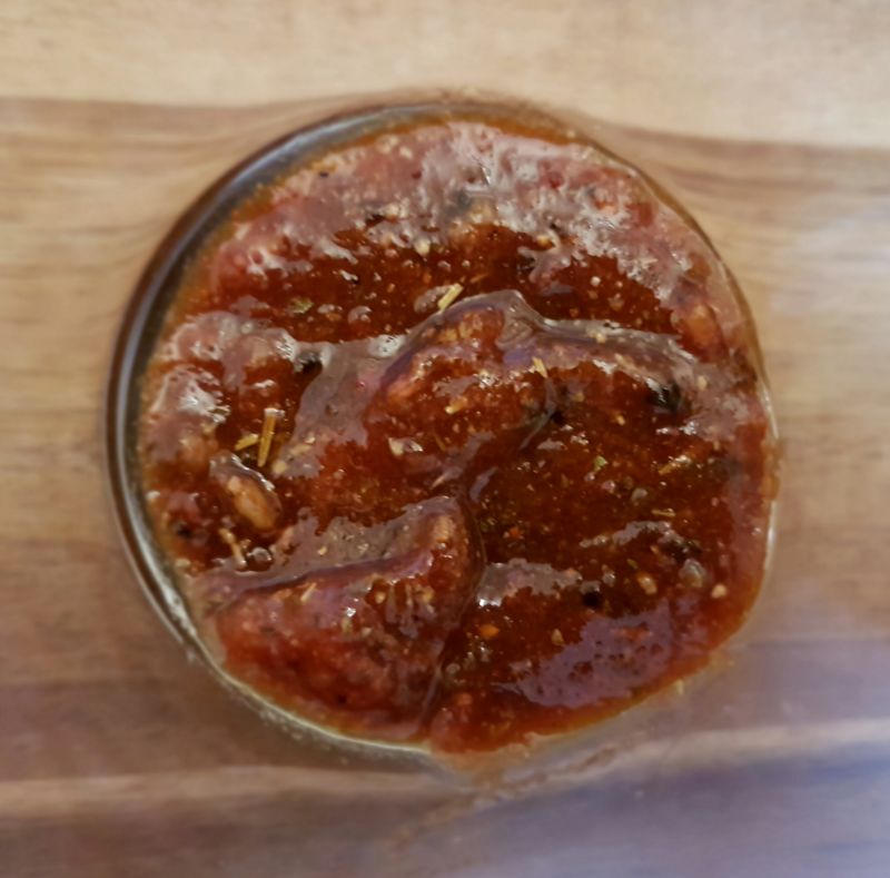 - Fleisch in gleichmäßig dünne Streifen schneiden und mit der Marinade vermengen. In einen Gefrierbeutel oder ähnliches geben und mindestens 1 Tag im Kühlschrank durchziehen lassen.