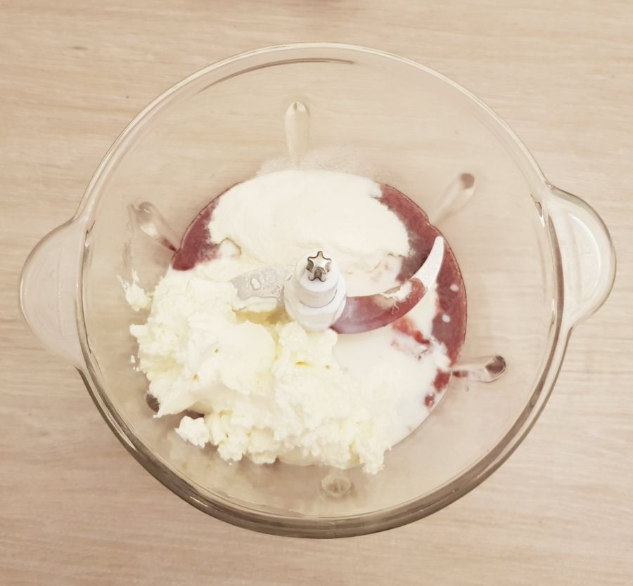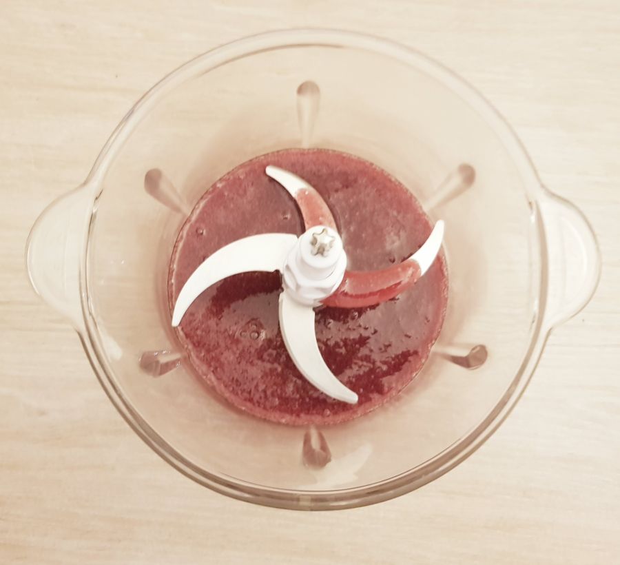 • Die Beerenmasse in einen Blender füllen, dann Quark, Kollagen und Milch hinzufügen und alles miteinander vermischen.