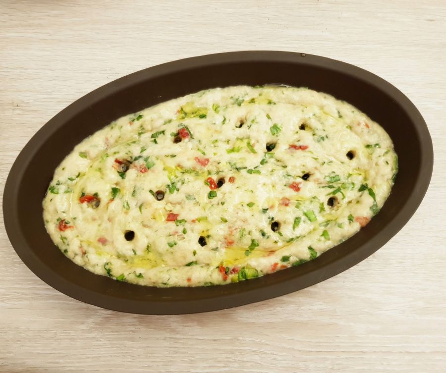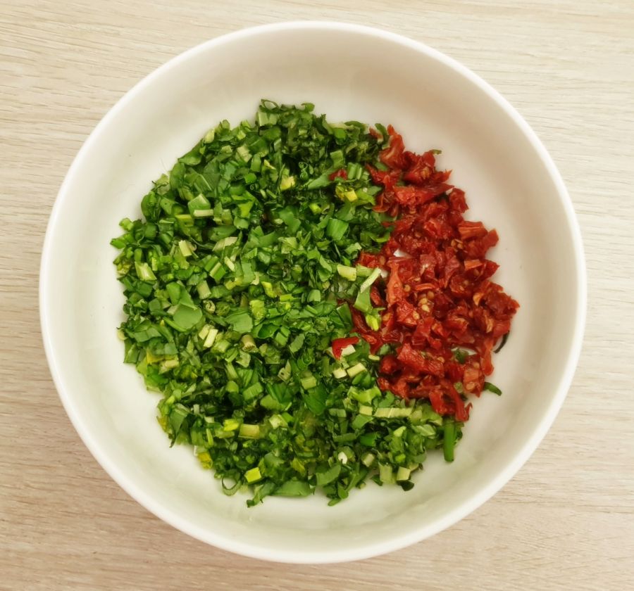 - Eine Schüssel vorbereiten. Ciabattamischung, Bärlauch, Tomaten, Gewürze, Öl und Wasser hinzufügen und zu einem Teig verarbeiten.