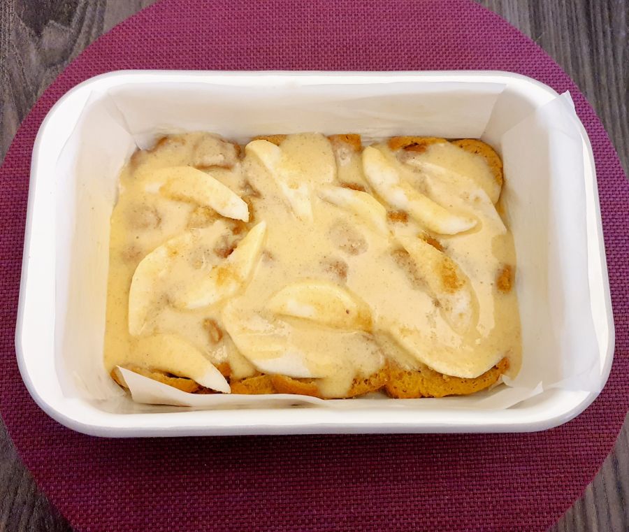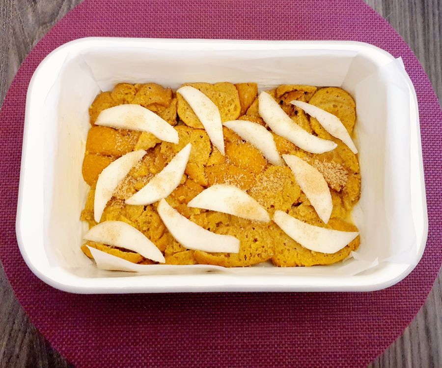 - Nun den Scheiterhaufen schichten: Mit den Brotscheiben beginnen, Birnenscheiben drauflegen und mit Karamelltraum bestreuen. Die Milch/Pfannkuchenmischung mit einem Löffel verteilen. Dann wieder Brotscheiben, Birnen, Karamelltraum und die Milch/Pfannkuchenmischung. Solange wiederholen bis alle Zutaten verbraucht sind.