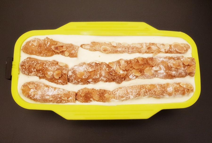 - Die Brandteigstangen in die Backform legen, bei Bedarf kürzen - Boden sollte bedeckt sein! Dann mit Creme auffüllen und die Backform an der Tischkante etwas aufklopfen, so verteilt sich die Creme gleichmäßig.