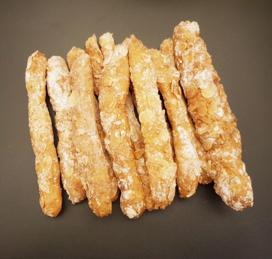 - Den Teig in einen Spritzsack mit Sterntülle füllen und auf ein mit Backpapier belegtes Gitter ca. 20cm lange Streifen spritzen (dickere und dünnere). Diese dann mit Karamelltraum, Mandelblättchen und Bambusfaser bestreuen. Bei 170 Grad 45 Minuten backen, nach 30 Minuten mit Alufolie abgedecken. Nach dem Backen auf einem Gitter auskühlen lassen, die überschüssige Bambusfaser abpinseln und mit Vanilletraum bestreuen.