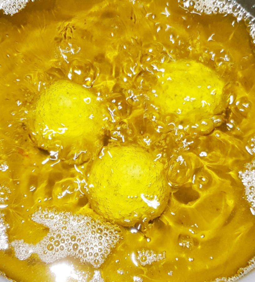 - In einer Mischung aus Rapsöl und Sonnenblumenöl für 8 Minuten frittieren, auf einem Küchentuch abtropfen lassen und auf ein Gitter setzen. Danach für 10 Minuten bei 180 Grad fertig im Backrohr backen.