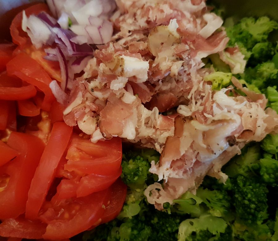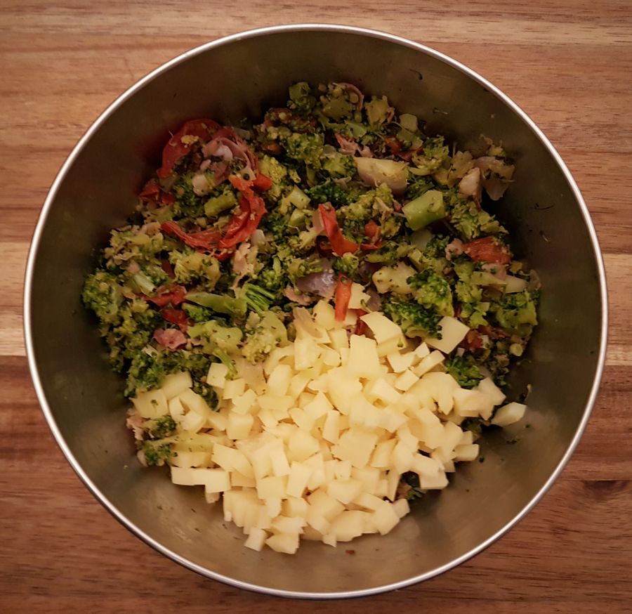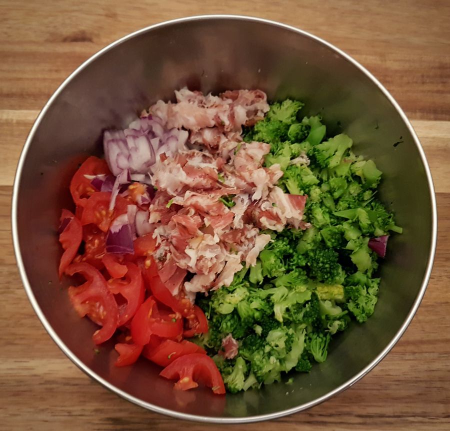 - Broccoli, rote Zwiebel, Tomaten und Speck in Ghee anbraten. Etwas abkühlen lassen.