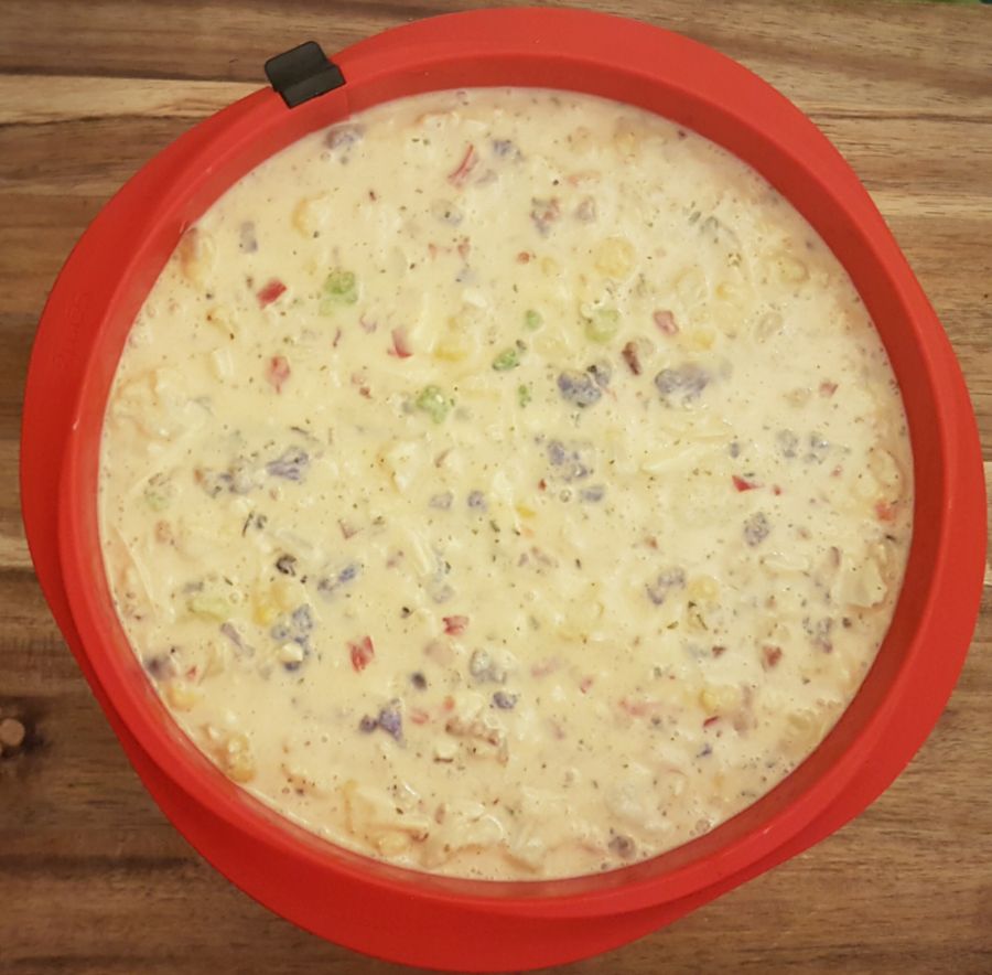 - Aus Pizzateig, Kuchenzauber, Eiern, weicher Butter und Gewürzen einen Teig zubereiten. Eine runde Backform mit ca. 23 cm vorbereiten (evtl. mit Backpapier auslegen) oder Silikonform benutzen. Den Teig auf dem Boden der Backform flachdrücken, mit einer Gabel einstechen und bei 180 Grad 25 Minuten vorbacken.