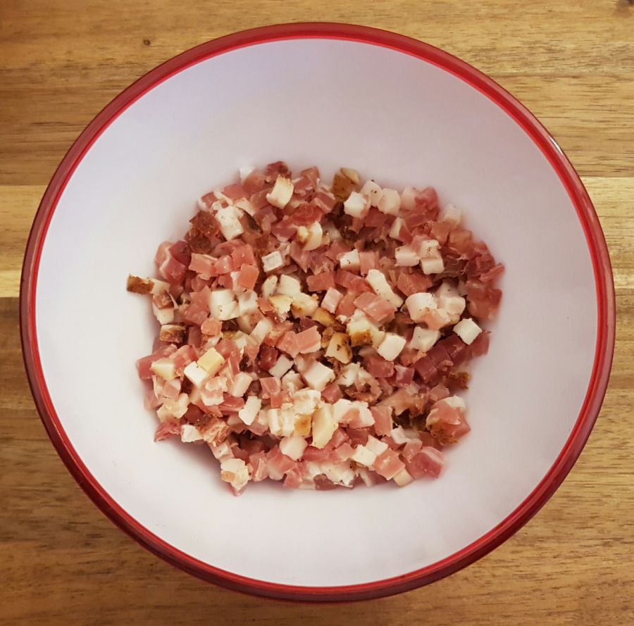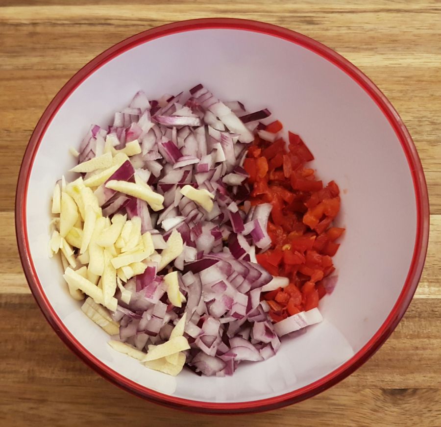 - Zwiebel, Speck, Paprika, Petersilie und Knoblauch in Ghee anbraten, Gewürze untermengen und zur Seite stellen.