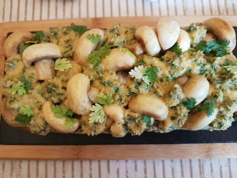 - Die restlichen 100g Champignons halbieren. In einer Pfanne mit Ghee und dem Saft der Zitrone (so bleiben sie schön hell) leicht anbraten und danach auf ein Küchenpapier legen.