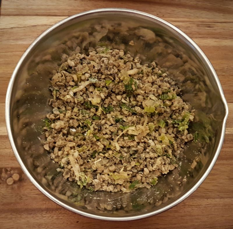 - Champignons putzen und 400g davon klein schneiden, Zwiebel klein schneiden und gemeinsam in Ghee anbraten. Wasser der Champignons ziehen lassen und so lange anbraten, bis das Wasser verdunstet ist. Mit Zitrusfaser vermengen und zur Seite stellen.