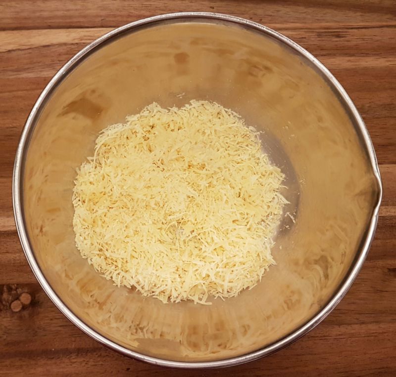 - In der Zwischenzeit Petersilie und Schnittlauch klein schneiden, Eigelb mit Gewürzen, Frischkäse, Abrieb der Zitrone (Saft wird später benötigt), geriebenem Cheddar und dem Paniermehl vermengen und in den Kühlschrank stellen.