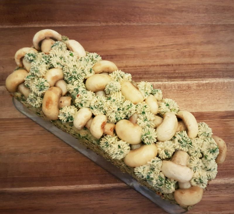 - Nach den 20 Minuten die Champignonshälften auf dem Kuchen verteilen und mit dem Spritzsack die Löcher ausfüllen. Danach nochmal bei 190 Grad für 15 Minuten ins Backrohr geben.