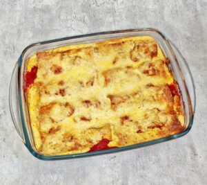 - Eine Auflaufform ca. 39 x 24 cm vorbereiten und mit 2/3 der Tomatensauce den Boden bedecken.