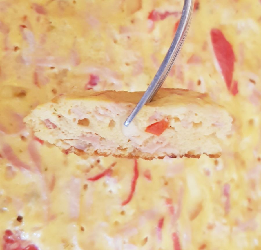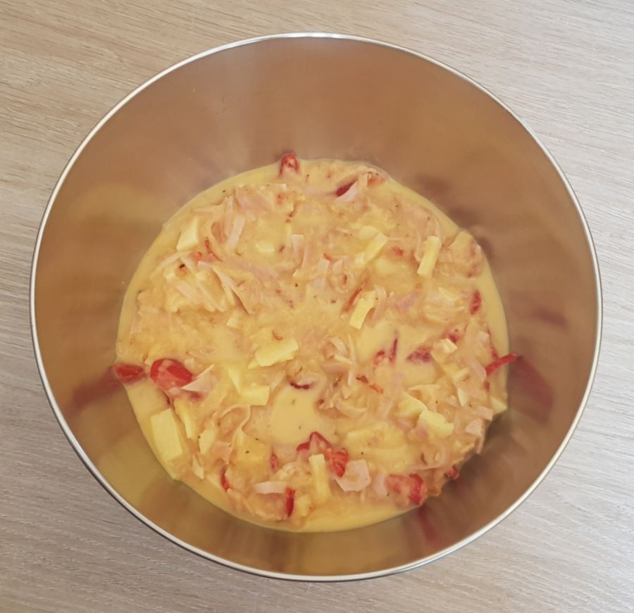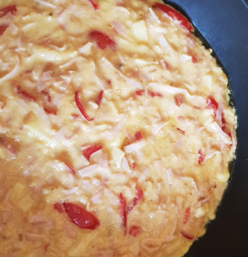 - Ei, Ayran und Gewürze miteinander vermengen, Kollagen und Pfannkuchenmischung hinzufügen, gut miteinander vermischen und Schinken, Paprika, Tomaten, Mozarella untermengen. Gewürze abschmecken, evtl. nachwürzen.