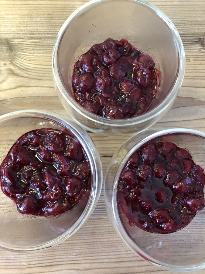 - In der Zwischenzeit die aufgetauten Kirschen mit Karamelltraum aufkochen und mit Gelierfix binden - nochmal kurz aufkochen lassen! Am Schluss 2 EL Kirschwasser unterrühren!