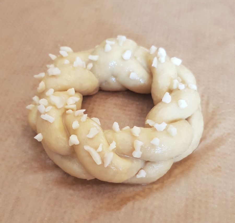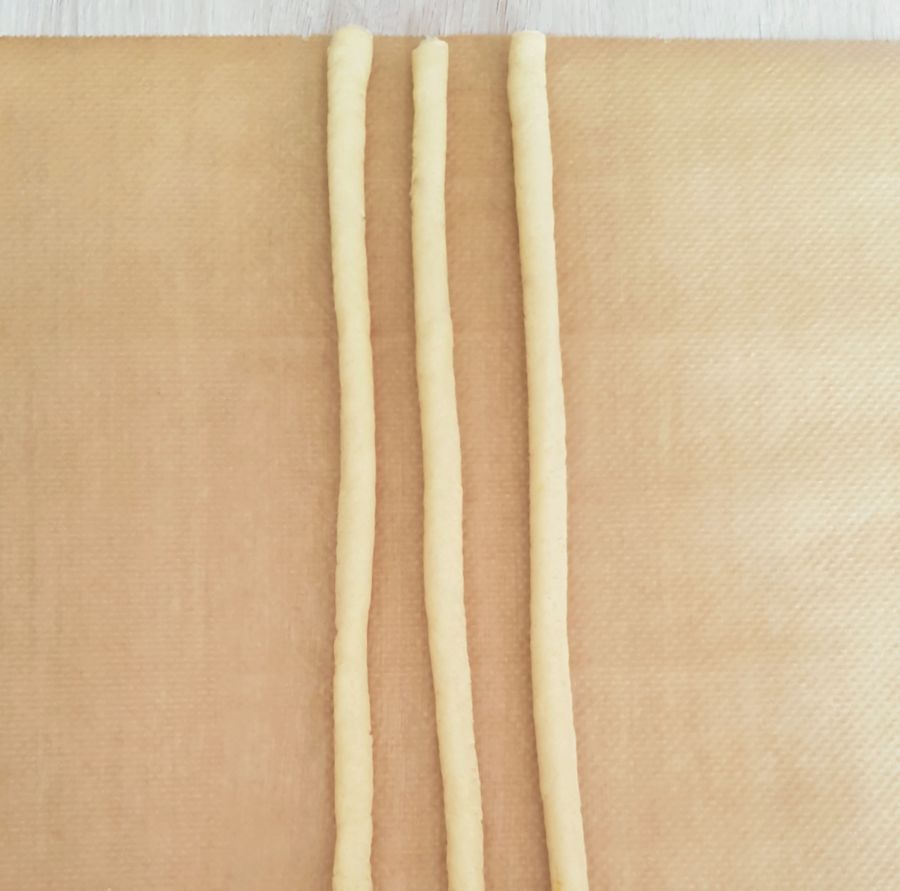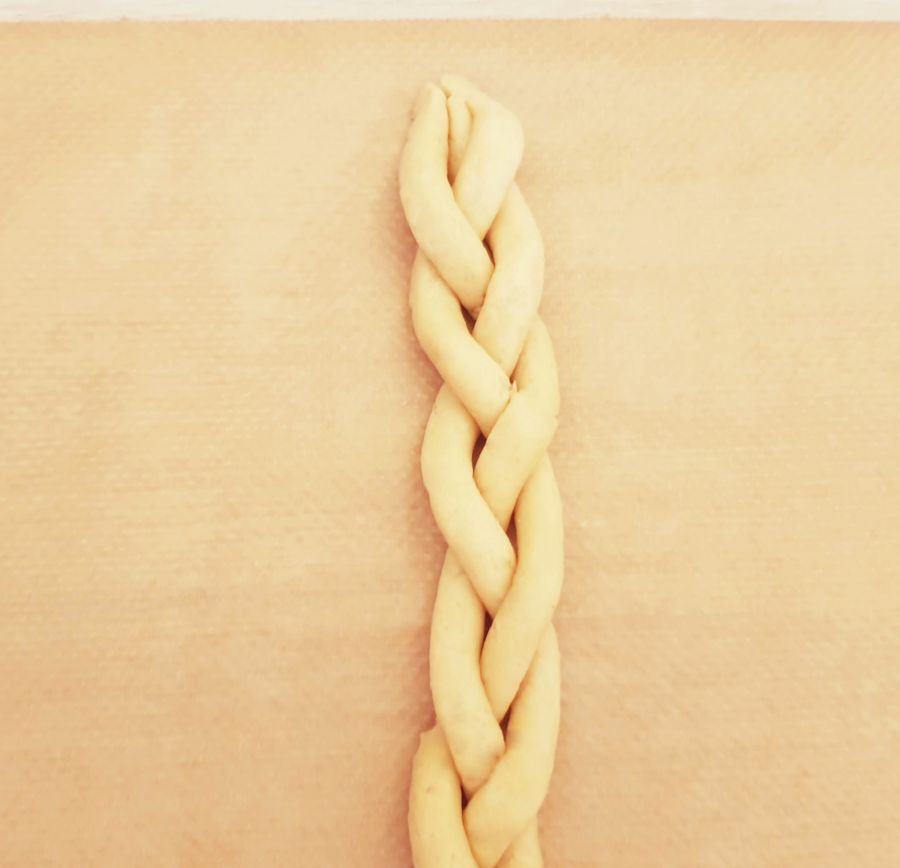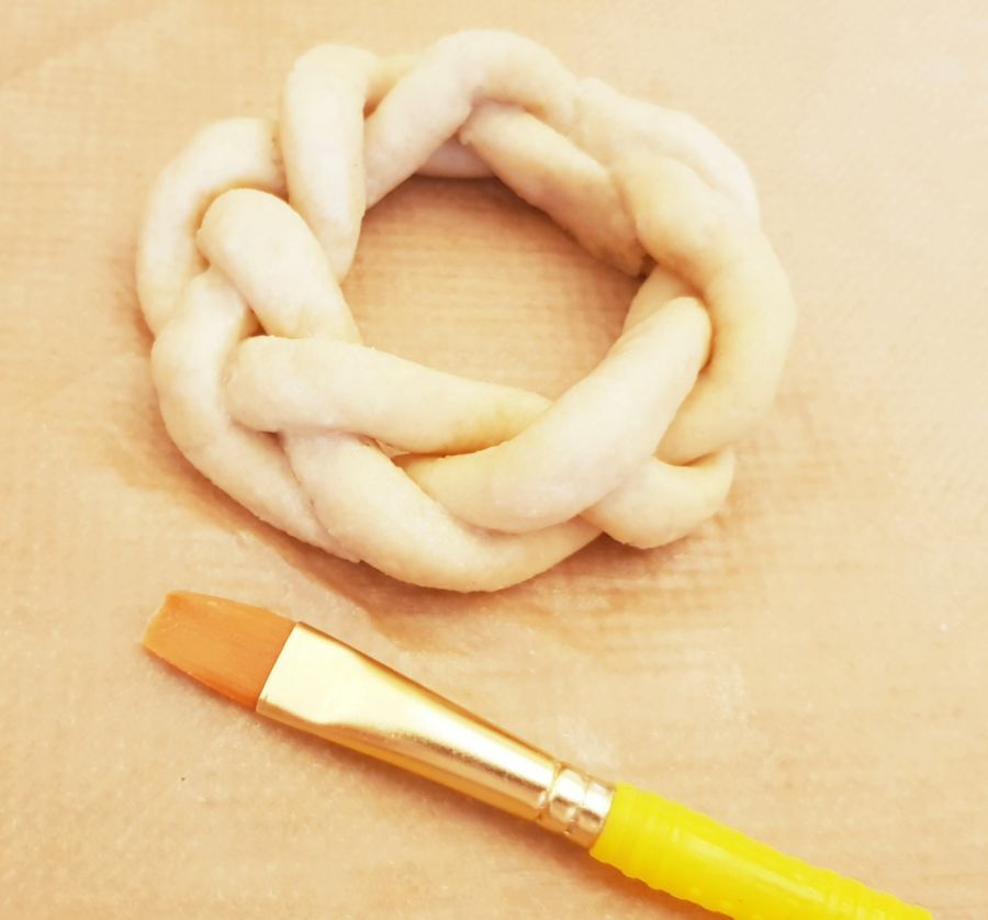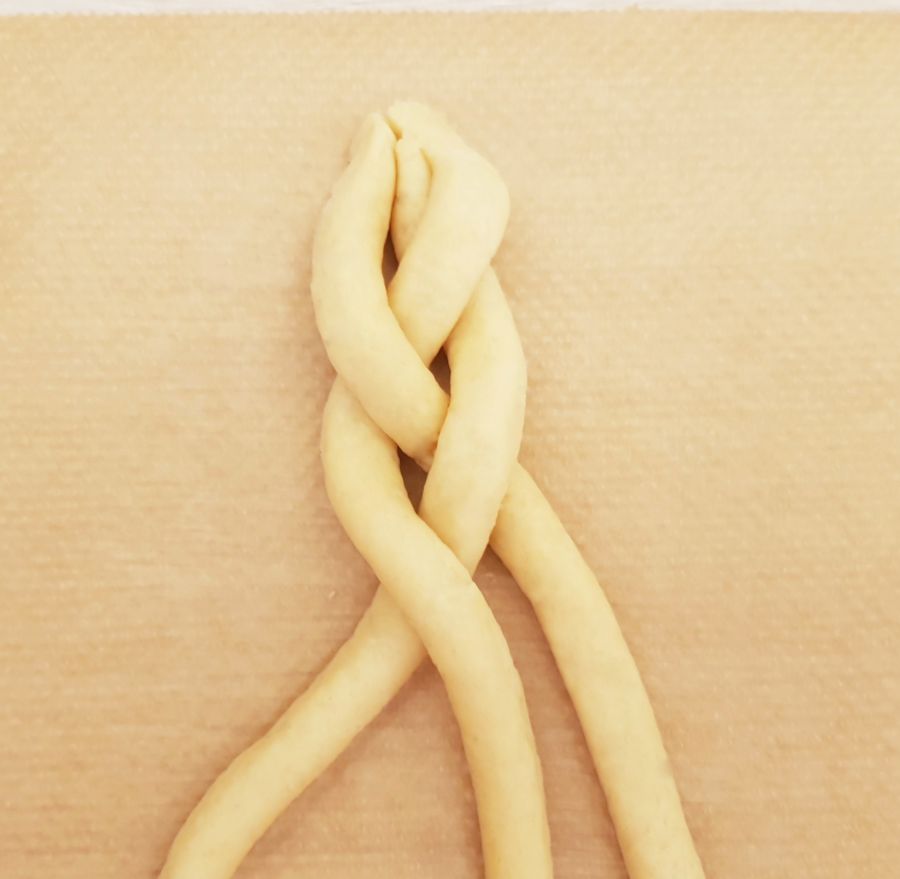 - Tipp: Wenn der Teig beim Flechten etwas ausfranzt, einfach mit einem kleinen Pinsel und Wasser ausbessern. So kann man die Teiglinge schön glatt bekommen. Man kann so auch kleine Macken ausbessern.