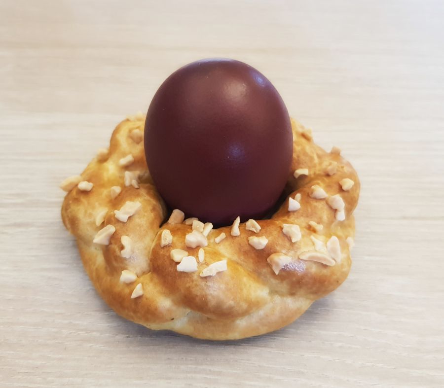 - Teig in je 25g teilen und mit Hilfe von Bambusfaser 3 Stränge mit der Hand drehen. Danach zu einem Zopf flechten. Den Zopf zu einem Kranz/Nesterl zusammen setzen, so dass ein Ei reinpasst.