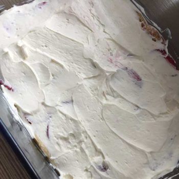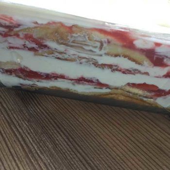 - Nun gehts los mit dem Schichten der Lasagne. Ihr benötigt eine Lasagne- oder Glasform in der Größe ca. 25 x 20 cm. Ihr beginnt mit dem Schichten mit Pfannkuchen. Darauf kommt etwas Erdbeerpüree, danach in Scheibchen geschnittene Erdbeeren, darauf etwas von der Creme. Dann wieder Pfannkuchen, Erdbeerpüree usw. Oben auf dann nur noch Pfannkuchen und etwas Creme. Ich habe 5 Lagen gemacht und einen Pfannkuchen für das Füllen der Ecken verwendet. (Siehe Bilder unten). Am Schluss könnt Ihr oben Backkakao drauf sieben oder eine Lage Erdbeeren als Abschluss geben!