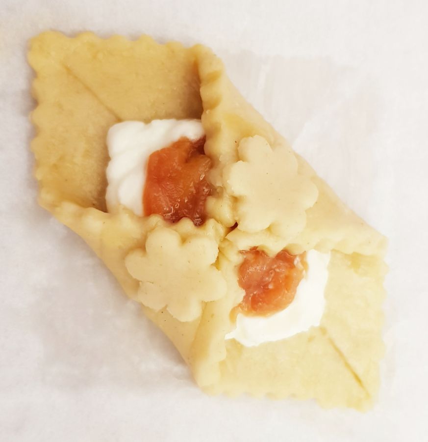 - Die Teigquadrate mit Ei bestreichen und im 1.Schritt die Quarkcreme aufspritzen (Mit Spritzsack). Danach die Erdbeer Rhababercreme mittig aufspritzen. Von beiden Seiten einklappen und leicht andrücken. Ich hab danach noch kleine Blümchen ausgestochen und auf die eingeschlagenen Ecken gesetzt. 2x mit Ei bestreichen.