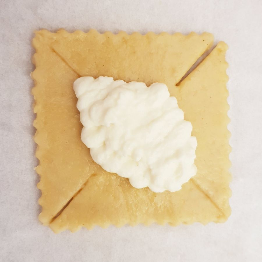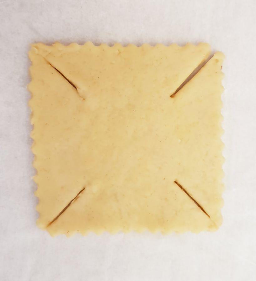 - Den Teig zwischen zwei Backpapier 4mm dick ausrollen. Mit einem Teigrädchen Quadrate in der Größe von 11 x 11 cm auschneiden. Danach ca. 2 cm lang die Ecken einschneiden (siehe Foto) - das macht man, damit der Teig beim Backen sich nicht aufstellt und die Form schön bleibt. Durchs Bestreichen vom Ei sieht man die Schnitte kaum mehr.