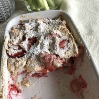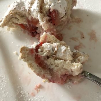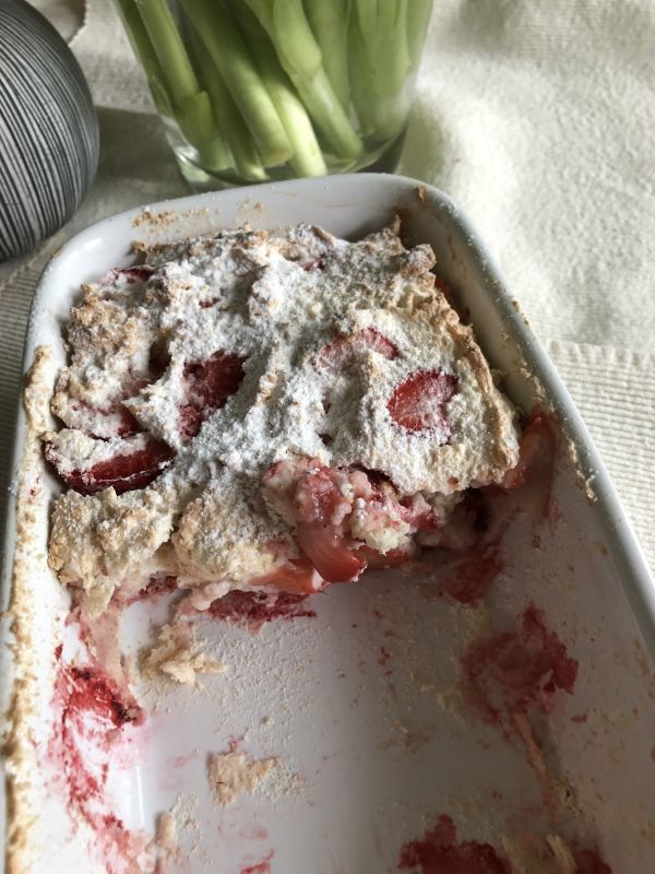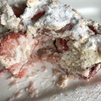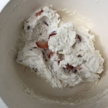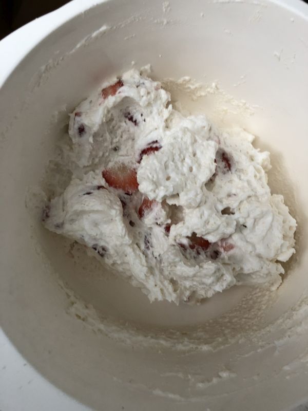 - Nun den Kuchenzauber vorsichtig in 2-3 Portionen mit einem Spatel unter die Baisermasse heben. Die klein geschnittenen Erdbeeren unterheben!