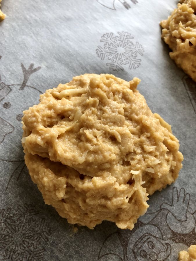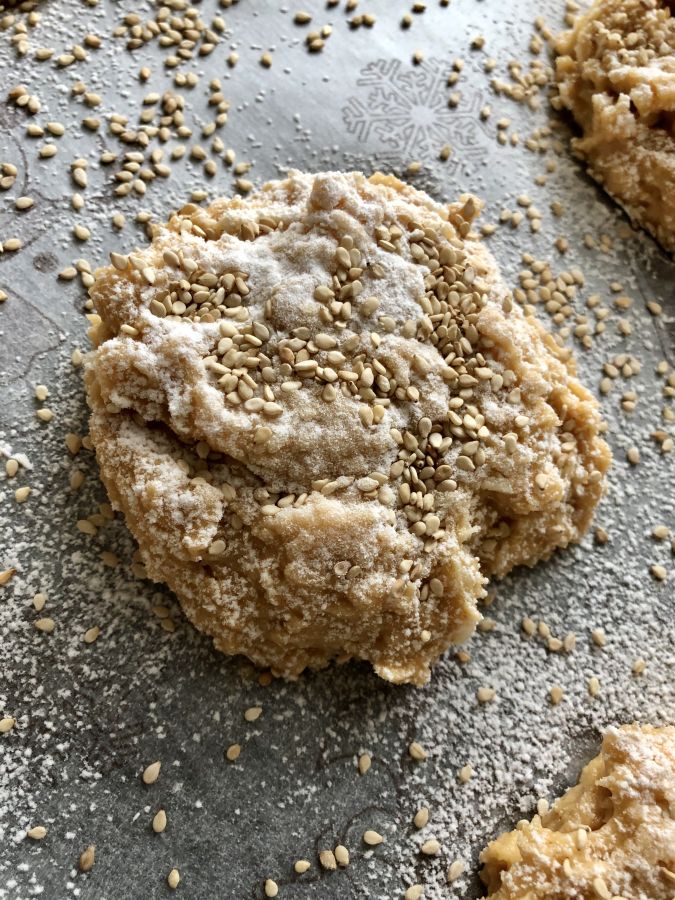 - Mit einem Löffel 6-7 Teighäufchen auf Backpapier setzen, etwas platt drücken (nur wenig siehe Fotos) - mit Bambusfaser bestäuben, Sesam draufgeben und bei 190 Grad Umluft ca. 60 Minuten backen! Auf Gitter auskühlen lassen.