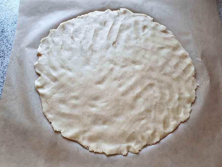 - Eine Springform mit Backpapier auskleiden. Den Mürbeteig in 5 gleichgroße Stücke aufteilen. 2 Stücke auf dem Boden ausrollen, mit 1 Stück den Rand hochziehen und mit den restlichen 2 Stücken auf einem separaten Stück Backpapier die Decke ausrollen. Dabei den Teig mit etwas Bambusfaser bemehlen, so lässt er sich besser ausrollen.
