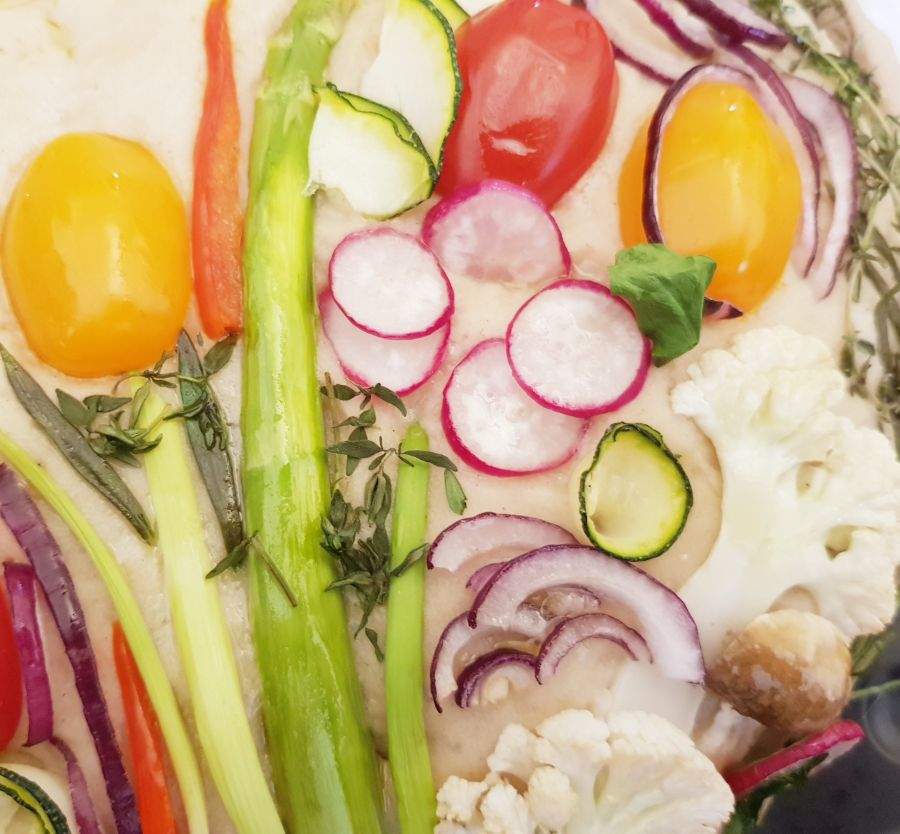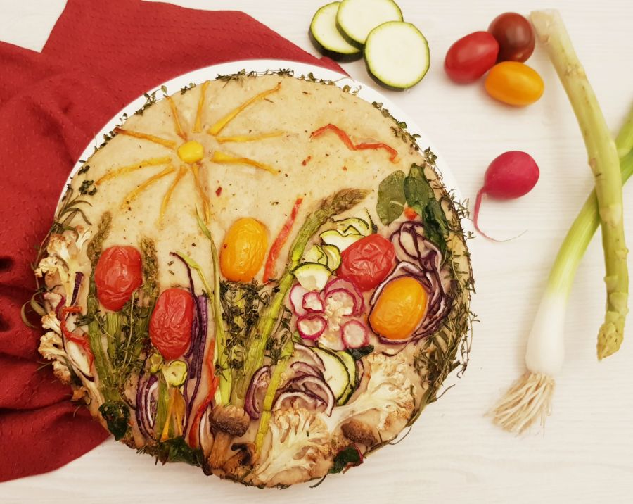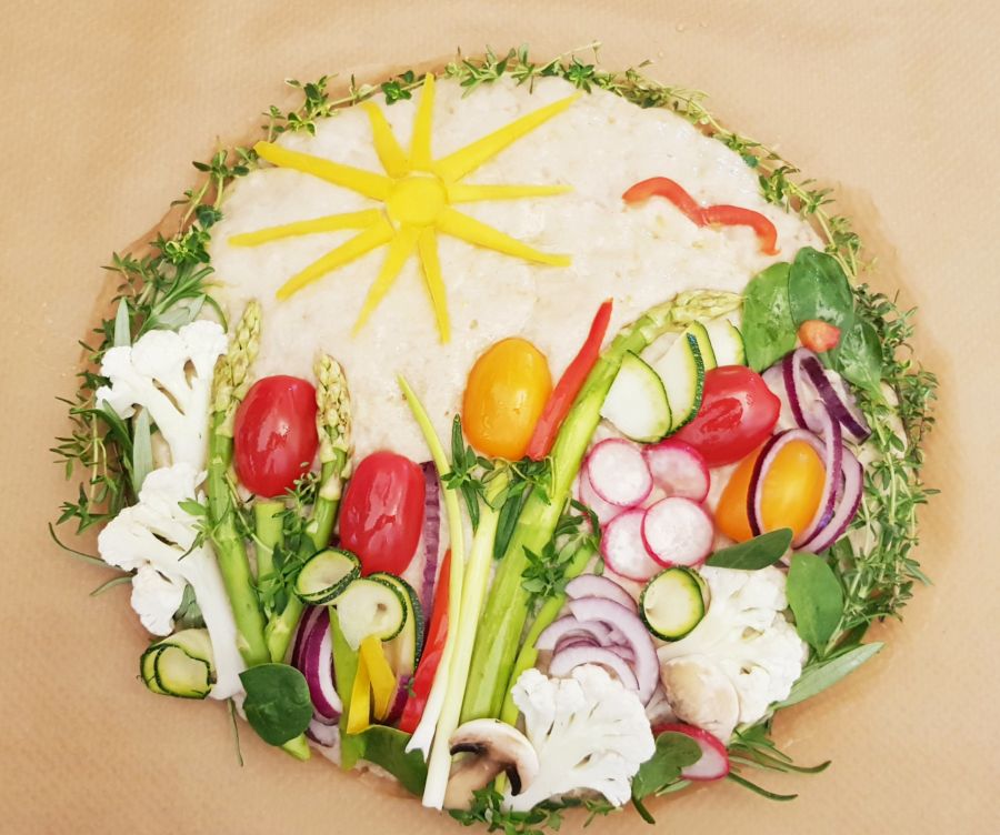 - Das Gemüse und die Kräuter ganz eng auflegen (hier ist Eure Kreativität gefragt). Mit einem feuchten Pinsel den Rest des Teiges, der noch zu sehen ist, glatt streichen. Danach alles komplett mit Öl bestreichen.