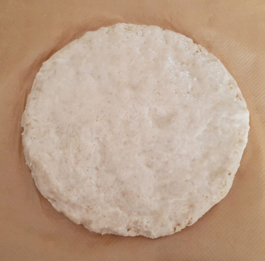 - Auf einem Backpapier einen ca. 3 cm hohen Kreis formen. Mit feuchten Fingern glatt streichen.