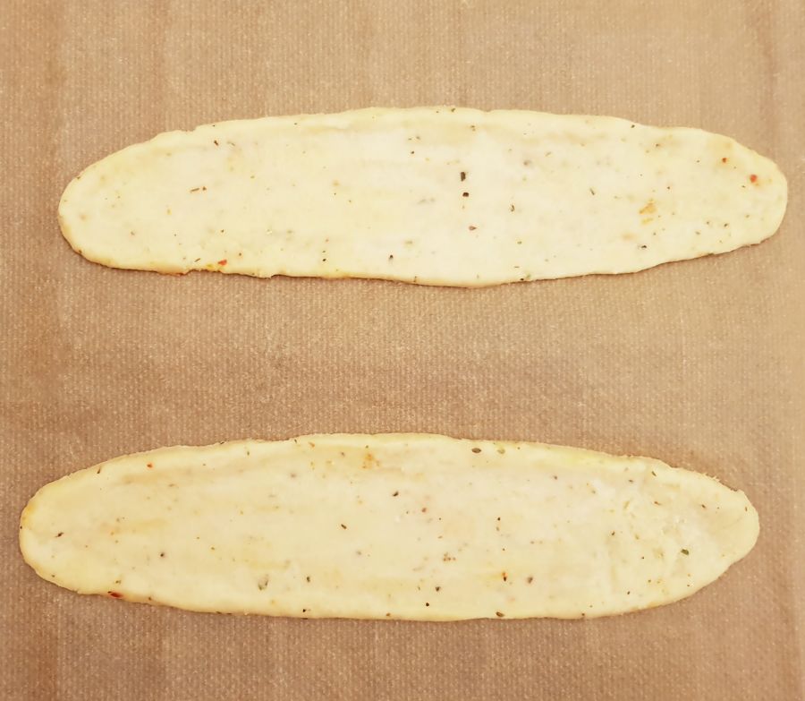 - Den Teig einmal kurz durchkneten und in 4 Teile teilen (Je 85g). Teig zwischen zwei Backpapier in längliche Schiffchen ausrollen und mit je 1/4 der Gurkenmasse belegen.