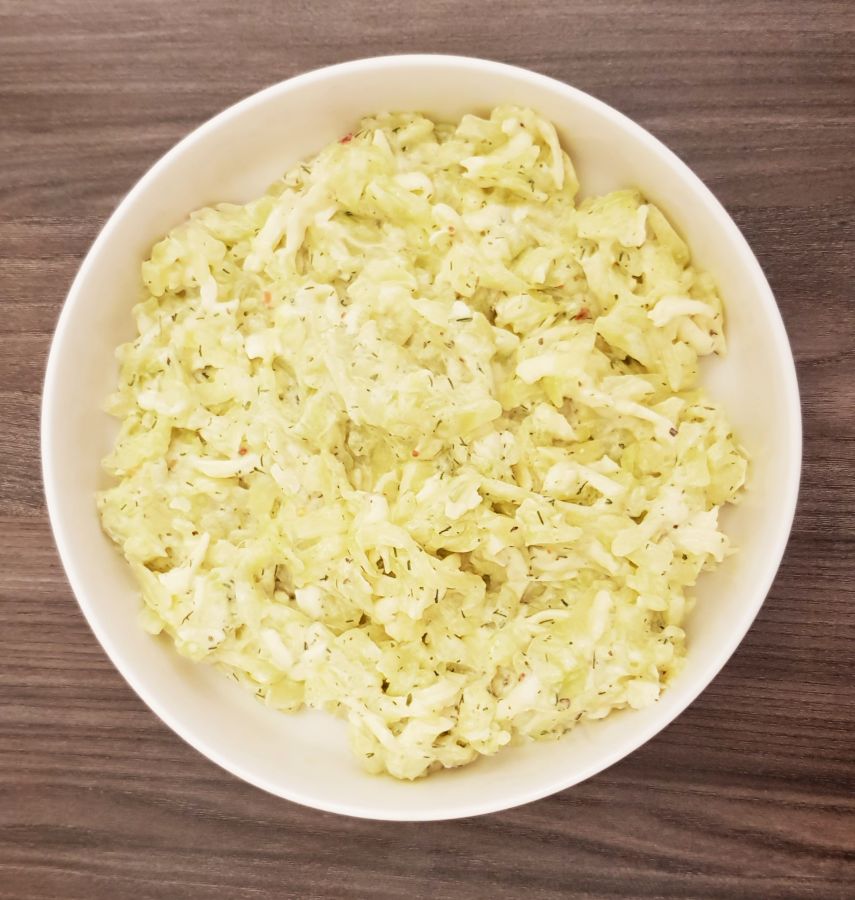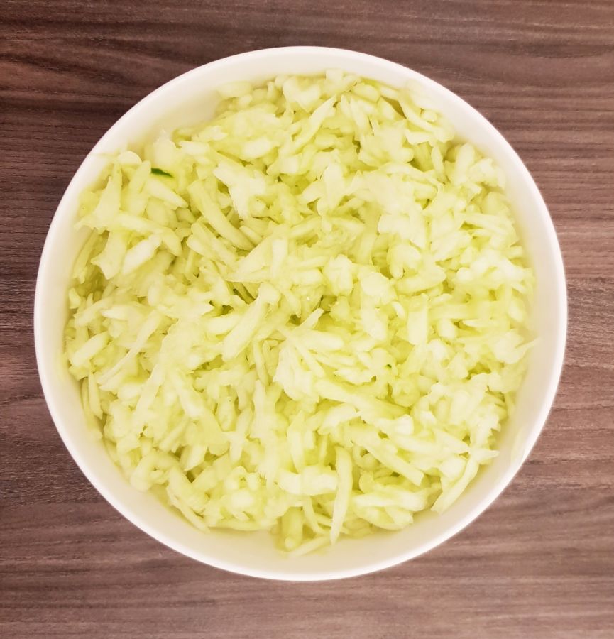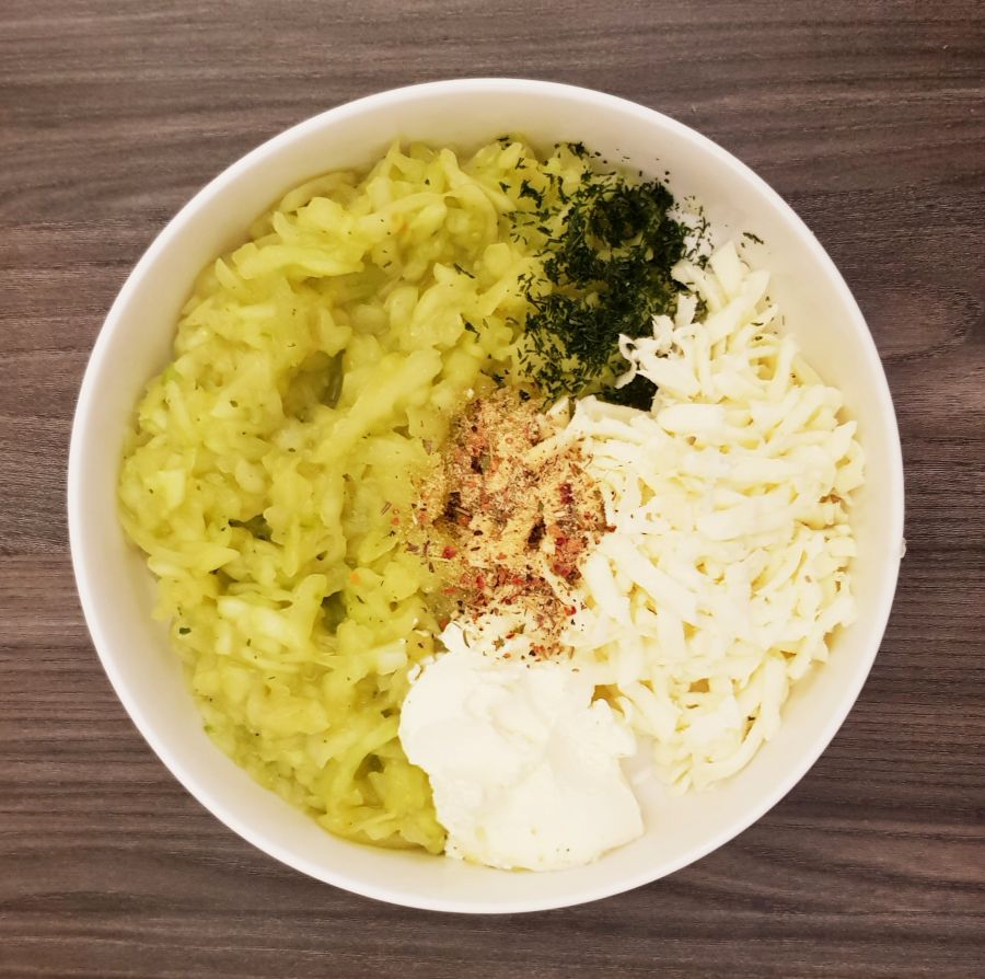 - In der Zwischenzeit die Gurken (ich hatte 2) schälen und die Gurkenkerne entfernen, dann grob raspeln. Die Gurken mit der Rinderbrühe kurz weich dünsten, bis die Brühe verdampft ist. In eine Schüssel füllen und etwas abkühlen lassen. Dann den Mozzarella grob reiben und in die Schüssel hinzufügen, sowie Creme Fraiche, Dill und Gewürze, alles gut miteinander vermischen. Abschmecken obs für einen selber so passt, eventuell nachwürzen.