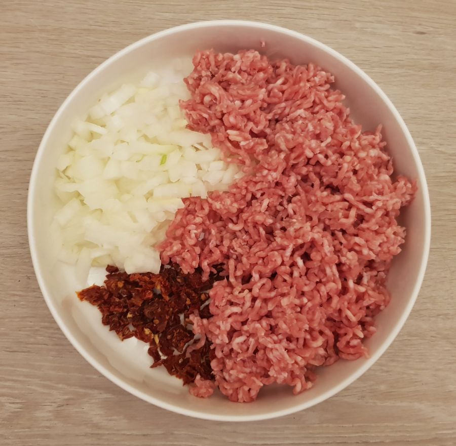 - Zwiebeln, getrocknete Tomaten und Hackfleisch in Ghee scharf anbraten, mit Hackfleischliebling und Gemüseliebling würzen. So lange braten bis der eigene Saft verkocht ist. In eine Schüssel füllen und zur Seite stellen.